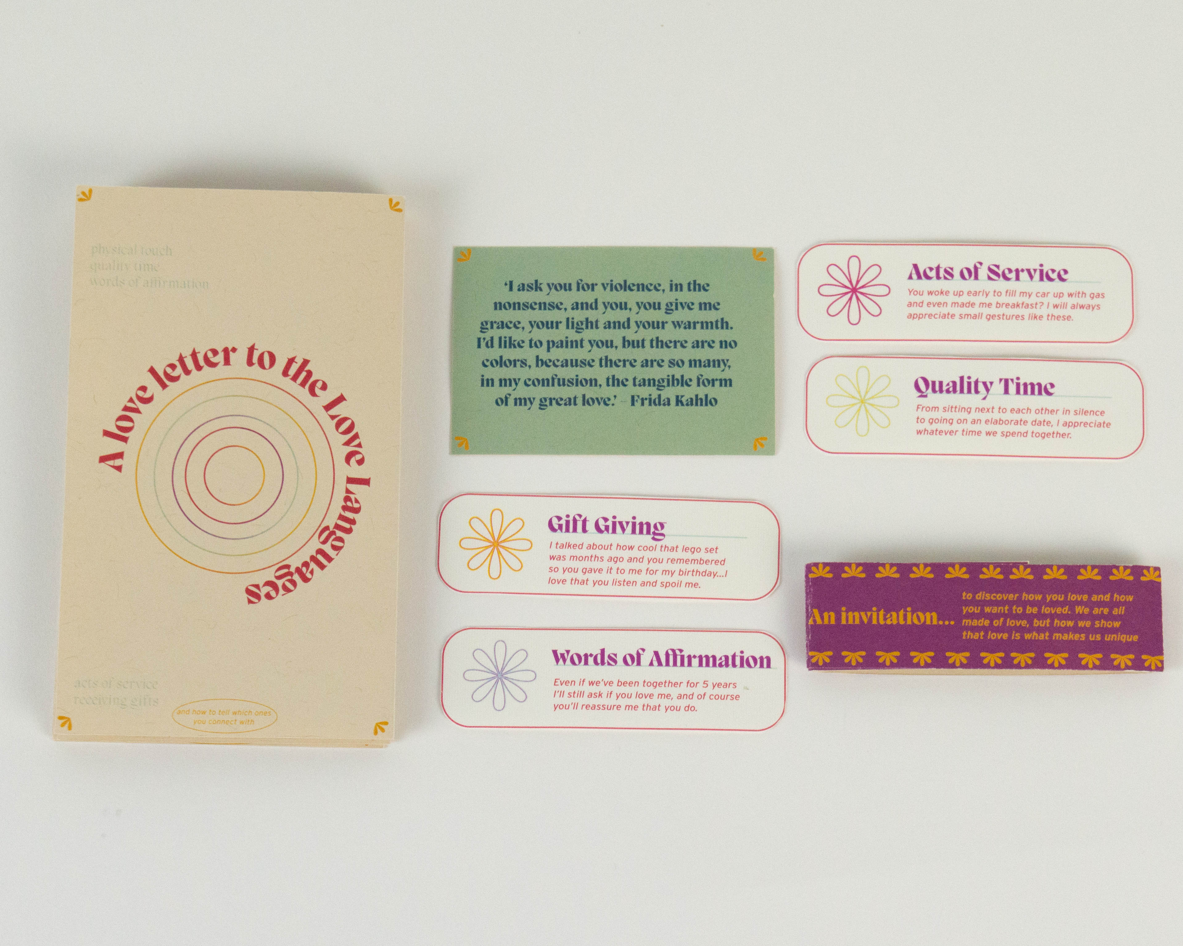She continued the process by researching the history of love and how it’s expressed in different cultures. Then she began to cultivate a mood board that displayed what she wanted her piece to look like. She decided that the primary text would be lines from various poems that spoke to each love language and that the secondary text would be lyrics from songs that did the same thing. She also made some decisions about what the kit would consist of such as a belly band, stickers and more.