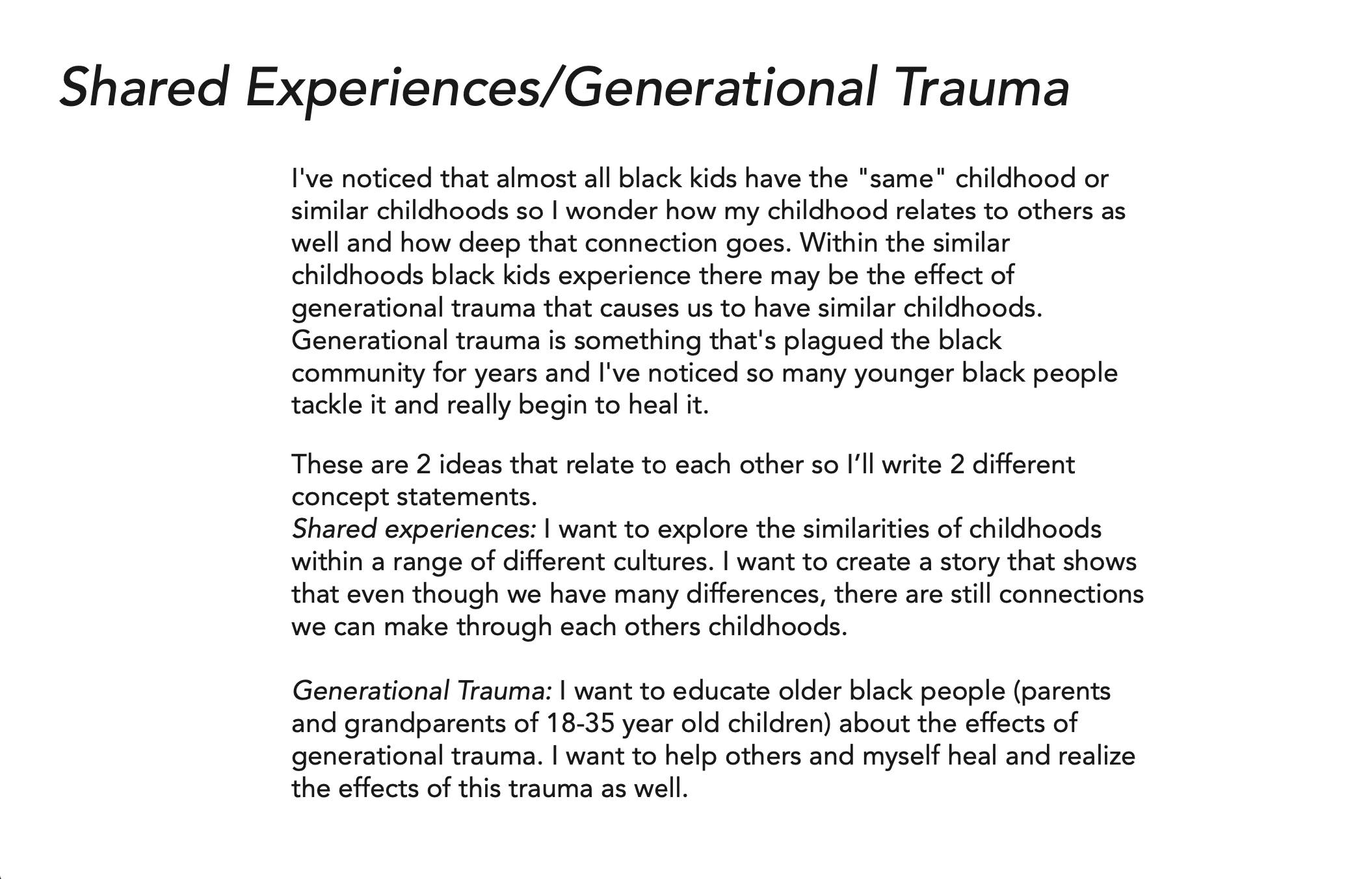 Kristin jumped right into creating concepts and concept statements. She created two main ones that she both really enjoyed but she was leaning more towards the one about AAVE. After some critique, she decided to go with the concept about AAVE. She didn’t initially know what she wanted to create as an end result so she went into research unsure of what would be the best result.