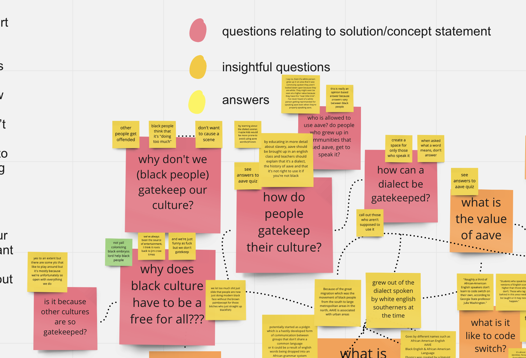 She wanted to go deep into her research but to keep herself grounded she came up with a couple key questions that directly related to her concept. One of the first things she did was create a survey that was sent to her black friends and their black friends. The survey asked questions about what it’s like to be an AAE speaker and their opinion about gatekeeping it. After receiving these answers she sorted through them and found commonalities between the answers that confirm her first impressions. She continued to delve deeper and with the help of her classmates she was able to come up with more questions to consider. She truly enjoyed the research phase because she was able to learn more about the way she speaks so that she can share it with others.
